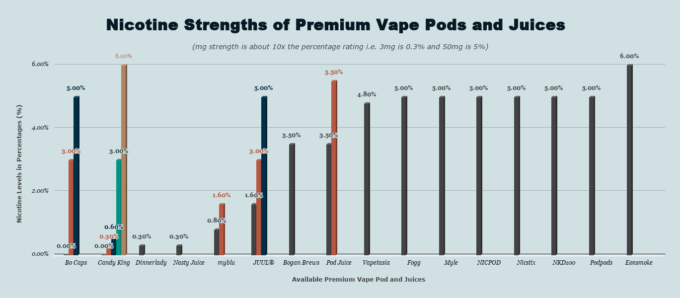 - Les e-liquides aux sels de nicotine couvrent, eux, 25 à 60 mg/ml, avec des dosages phares à 30 et 50 mg.